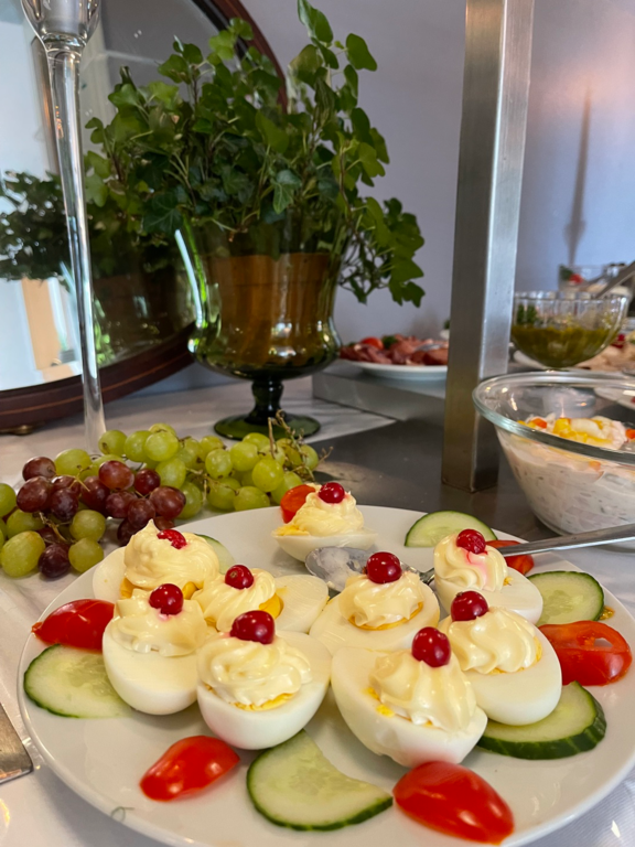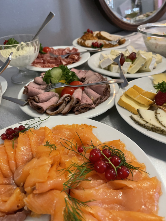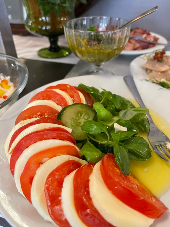 Wir bereiten die allermeisten Speisen (Antipasti, Roastbeef, Salate, Süßspeisen, Marmeladen, Schoko-Nußcréme, Lemon Curd) im Hause zu, verwenden Zutaten von bester Qualität und nach Möglichkeit von